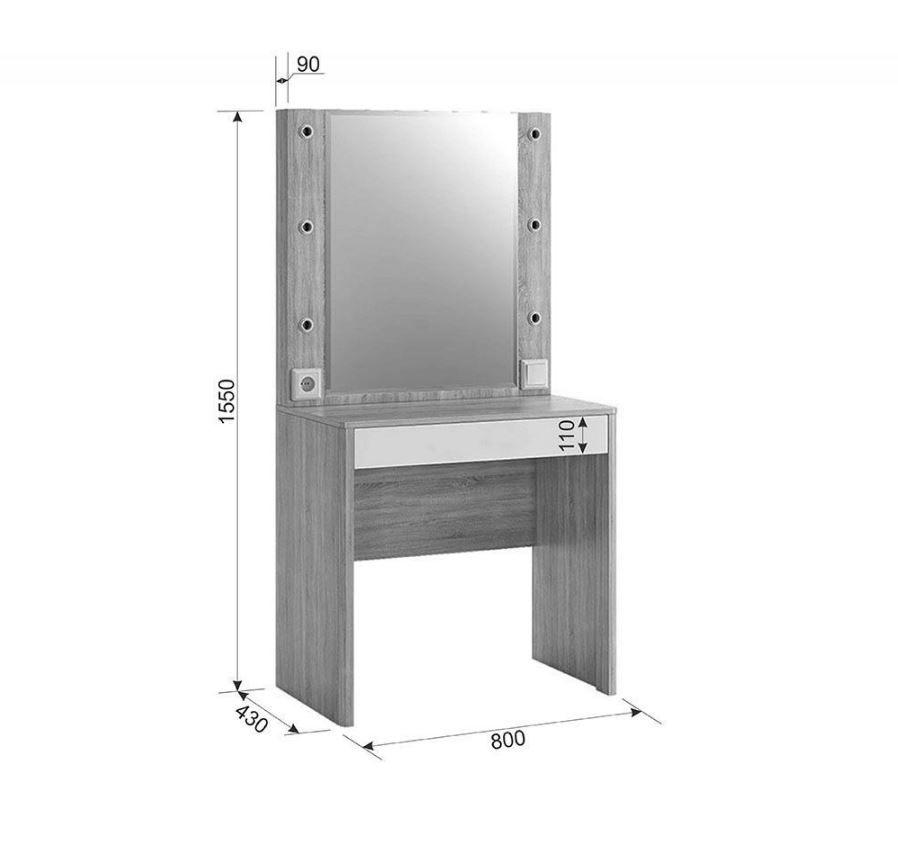 Оригинальное и стильное трюмо из серии «Зара». В зеркало с широким фацетом, встроена подсветка c 6 лампочками, как в столах профессиональных визажистов. Дополнительно имеется выключатель, розетка для фена и выдвижной ящик для украшений и косметики. Закругленные углы, подчеркивают общий стиль коллекции.